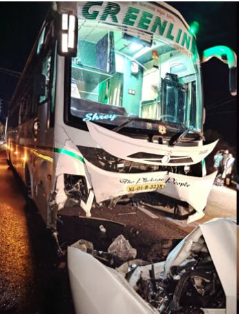 ಕರ್ನೂಲ್ : ಆಲೂರು ಪೊಲೀಸ್ ಠಾಣಾ ವ್ಯಾಪ್ತಿಯಲ್ಲಿ ಅತಿ ವೇಗವಾಗಿ ಬಂದ ಕಾರು, ಬೆಂಗಳೂರಿಗೆ ಹೊರಟಿದ್ದ ಗ್ರೀನ್ ಲೈನ್ ಖಾಸಗಿ ಬಸ್ಗೆ ಮುಖಾಮುಖಿ ಡಿಕ್ಕಿ ಹೊಡೆದಿದೆ. ಡಿಕ್ಕಿಯ ರಭಸಕ್ಕೆ ಕಾರು ಸಂಪೂರ್ಣವಾಗಿ ನಜ್ಜುಗುಜ್ಜಾಗಿದ್ದು, ತಕ್ಷಣವೇ ಬೆಂಕಿ ಹೊತ್ತಿಕೊಂಡಿದೆ.