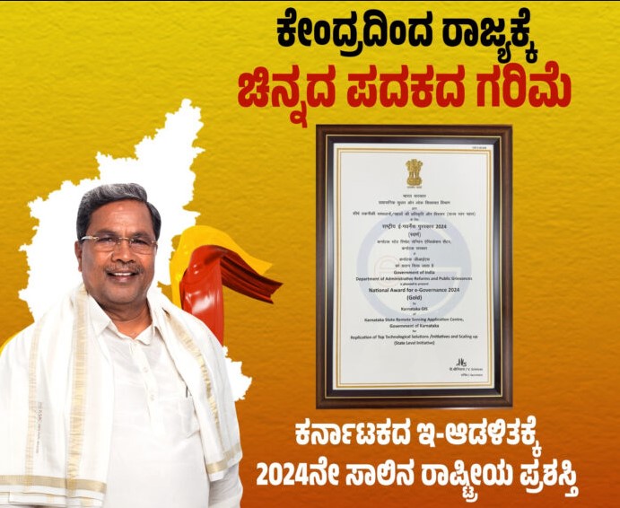 ಬೆಂಗಳೂರು: ಕೇಂದ್ರ ಸರ್ಕಾರದಿಂದ ರಾಜ್ಯಕ್ಕೆ 2024ನೇ ಸಾಲಿನ “ರಾಷ್ಟ್ರೀಯ ಇ-ಆಡಳಿತ ಪ್ರಶಸ್ತಿ” ಲಭಿಸಿದೆ ಎಂದು ಸಿಎಂ ಸಿದ್ದರಾಮಯ್ಯ ತಿಳಿಸಿದ್ದಾರೆ.