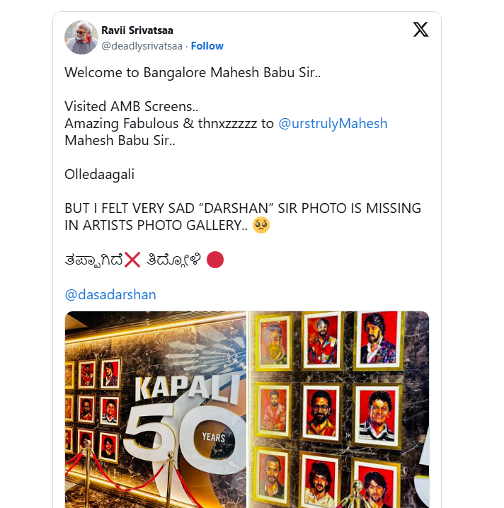 ಕಪಾಲಿ ಚಿತ್ರಮಂದಿರವು ಕನ್ನಡ ಸಿನಿಮಾಗಳ ಭದ್ರಕೋಟೆಯಾಗಿತ್ತು. ಅಂತಹ ಜಾಗದಲ್ಲಿ ನಿರ್ಮಾಣವಾಗಿರುವ ಹೊಸ ಮಲ್ಟಿಫ್ಲೆಕ್ಸ್ನಲ್ಲಿ ದರ್ಶನ್ ಅವರಂತಹ ದೊಡ್ಡ ಸ್ಟಾರ್ ನಟನ ಫೋಟೋ ಕೈಬಿಟ್ಟಿರುವುದು ದರ್ಶನ್ ಅಭಿಮಾನಿಗಳ ಕೆಂಗಣ್ಣಿಗೂ ಗುರಿಯಾಗಿದೆ. ಮಹೇಶ್ ಬಾಬು ಮಾಲೀಕತ್ವದ ಈ ಮಲ್ಟಿಫ್ಲೆಕ್ಸ್ ಆಡಳಿತ ಮಂಡಳಿ ಉದ್ದೇಶಪೂರ್ವಕವಾಗಿ ಇದನ್ನು ಮಾಡಿದೆಯೇ ಅಥವಾ ಇದು ತಾಂತ್ರಿಕ ತಪ್ಪೇ ಎಂಬ ಚರ್ಚೆ ಈಗ ಗಾಂಧಿನಗರದಲ್ಲಿ ಜೋರಾಗಿದೆ.