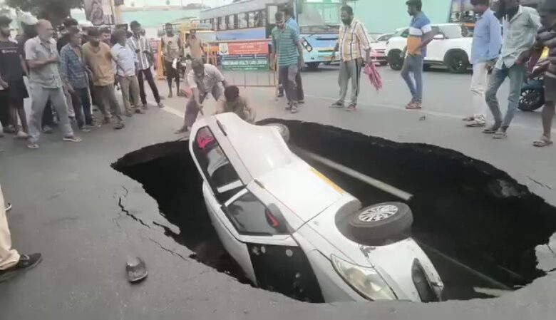 ಹಠಾತ್ ಸೃಷ್ಟಿಯಾದ ರಸ್ತೆಯ ಗುಂಡಿಗೆ ಕಾರು ಮಗುಚಿ ಅಪಘಾತ ಸಂಭವಿಸಿದ ಘಟನೆ ಚೆನ್ನೈನಲ್ಲಿ ನಡೆದಿದೆ.