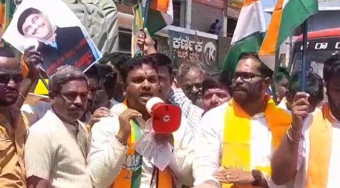 ಚಾಮರಾಜನಗರದ ಚಾಮರಾಜೇಶ್ವರ ದೇವಸ್ಥಾನದ ಆವರಣದಿಂದ ಭುವನೇಶ್ವರಿ ವೃತ್ತದವರೆಗೆ ಪ್ರತಿಭಟನಾ ಮೆರವಣಿಗೆ ನಡೆಸಿದ ಬಿಜೆಪಿ ಕಾರ್ಯಕರ್ತರು ರಾಷ್ಟ್ರೀಯ ಹೆದ್ದಾರಿ ತಡೆದು ಆಕ್ರೋಶ ಹೊರಹಾಕಿದರು.