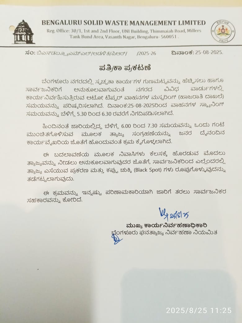 ಬೆಂಗಳೂರು ನಗರದಲ್ಲಿ ಸ್ವಚ್ಛತಾ ಕಾರ್ಯಗಳ ಗುಣಮಟ್ಟವನ್ನು ಹೆಚ್ಚಿಸಲು ಹಾಗೂ ಸಾರ್ವಜನಿಕರಿಗೆ ಅನುಕೂಲವಾಗುವಂತೆ ನಗರದ ವಿವಿಧ ವಾರ್ಡ್ ಗಳಲ್ಲಿ ಕಾರ್ಯನಿರ್ವಹಿಸುತ್ತಿರುವ ಆಟೋ ಟಿಪ್ಪರ್ ವಾಹನಗಳ ಮಸ್ಟರಿಂಗ್ ಸಮಯವನ್ನು ಪರಿಷ್ಕರಿಸಲಾಗಿದೆ.