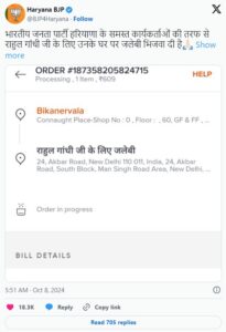 ಹರಿಯಾಣದಲ್ಲಿ ಭಾರತೀಯ ಜನತಾ ಪಕ್ಷದ ಎಲ್ಲಾ ಕಾರ್ಯಕರ್ತರ ಪರವಾಗಿ ರಾಹುಲ್ ಗಾಂಧಿಯವರ ಮನೆಗೆ ಜಿಲೇಬಿಯನ್ನು ಕಳುಹಿಸಲಾಗಿದೆ ಎಂದು ಬಿಜೆಪಿ ಎಕ್ಸ್ನಲ್ಲಿ ತಿಳಿಸಿದೆ. ದೆಹಲಿ ಮೂಲದ ಫುಡ್ ಡೆಲಿವರಿ ಆ್ಯಪ್ ಆದ ಸ್ವಿಗ್ಗಿಯ ಅಪ್ಲಿಕೇಶನ್ನ ಸ್ಕ್ರೀನ್ಶಾಟ್ ಅನ್ನು ಎಕ್ಸ್ನಲ್ಲಿ ಲಗತ್ತಿಸಲಾಗಿದೆ. ರಾಹುಲ್ ಗಾಂಧಿಗೆ ಸ್ವಿಗ್ಗಿಯಲ್ಲಿ ಜಿಲೇಬಿ ಕಳುಹಿಸಲಾಗಿದ್ದು, ಕ್ಯಾಶ್ ಆನ್ ಡೆಲಿವರಿ ಆಯ್ಕೆ ನೀಡಲಾಗಿದೆ! ರಾಹುಲ್ ಗಾಂಧಿಯವರೇ ಹಣ ಪಾವತಿಸಿ ಈ ಜಿಲೇಬಿ ಬಾಕ್ಸ್ ಪಡೆಯಬೇಕಾಗುತ್ತದೆ.
