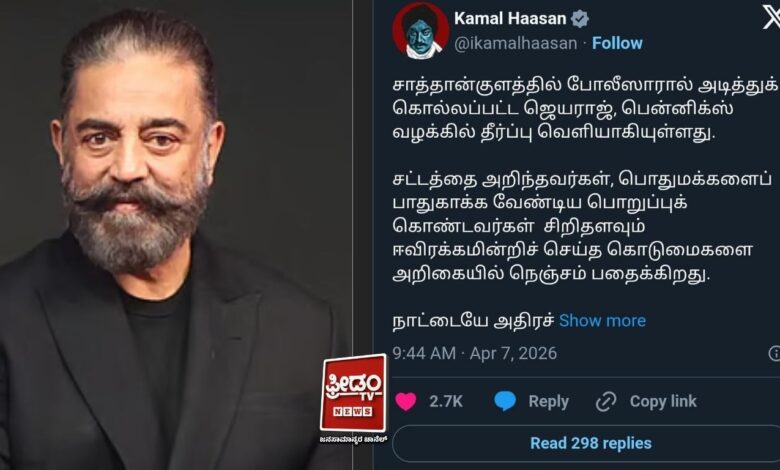 ತಮಿಳುನಾಡಿನ ಸಾತಾಂಕುಲಂನಲ್ಲಿ ನಡೆದ ಜಯರಾಜ್ ಮತ್ತು ಬೆನ್ನಿಕ್ಸ್ ಅವರ ಭೀಕರ ಲಾಕಪ್ ಡೆತ್ ಪ್ರಕರಣಕ್ಕೆ ಸಂಬಂಧಿಸಿದಂತೆ ಮಧುರೈ ನ್ಯಾಯಾಲಯ ನೀಡಿರುವ ಐತಿಹಾಸಿಕ ತೀರ್ಪಿನ ಬಗ್ಗೆ ನಟ ಮತ್ತು ರಾಜಕಾರಣಿ ಕಮಲ್ ಹಾಸನ್ ಅವರು ಸುದೀರ್ಘವಾದ ಪ್ರತಿಕ್ರಿಯೆ ನೀಡಿದ್ದಾರೆ. ಅಂದಿನ ಲಾಕ್ಡೌನ್ ಸಮಯದಲ್ಲಿ ನಡೆದ ಈ ತಂದೆ-ಮಗನ ಕ್ರೂರ ಹತ್ಯೆಗೆ ಕಾರಣರಾದ 9 ಮಂದಿ ಪೊಲೀಸರಿಗೆ ಮರಣದಂಡನೆ ಶಿಕ್ಷೆ ವಿಧಿಸಿರುವುದನ್ನು ಅವರು ಸ್ವಾಗತಿಸಿದ್ದಾರೆ. ರಕ್ಷಕರೇ ಭಕ್ಷಕರಾದಾಗ ಮೃತ್ಯುದಂಡನೆಯೇ ಗತಿ ಎಂಬಂತೆ ಈ ತೀರ್ಪು ಬಂದಿದೆ ಎಂದು ಅಭಿಪ್ರಾಯಪಟ್ಟಿದ್ದಾರೆ.