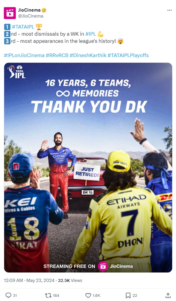 ಎಲಿಮಿನೇಟರ್ನಲ್ಲಿ ರಾಜಸ್ಥಾನ್ ರಾಯಲ್ಸ್ ವಿರುದ್ಧ ಸೋತ ನಂತರ ವಿರಾಟ್ ಕೊಹ್ಲಿ ಕೂಡ ದಿನೇಶ್ ಕಾರ್ತಿಕ್ ಅವರನ್ನು ಅಪ್ಪಿಕೊಂಡು ಭಾವುಕರಾದರು. ರಾಜಸ್ಥಾನ್ ರಾಯಲ್ಸ್ ತಂಡದೊಂದಿಗೆ ಕೊನೆಯವರೆಗೂ ಹೋರಾಡಿದ ಆರ್ಸಿಬಿ, ರೋವ್ಮನ್ ಪೊವೆಲ್ ಅವರನ್ನು ಕಟ್ಟಿ ಹಾಕಲು ಸಾಧ್ಯವಾಗದೆ ಸೋಲು ಒಪ್ಪಿಕೊಂಡಿತು. ಇದರಿಂದಾಗಿ ಕೊನೆಯ ಬಾರಿ ಐಪಿಎಲ್ ಕಪ್ ಹಿಡಿದು ವೃತ್ತಿ ಜೀವನಕ್ಕೆ ಅದ್ಧೂರಿಯಾಗಿ ವಿದಾಯ ಹೇಳುವ ಅವಕಾಶವನ್ನೂ ಕಾರ್ತಿಕ್ ಕಳೆದುಕೊಂಡರು.
