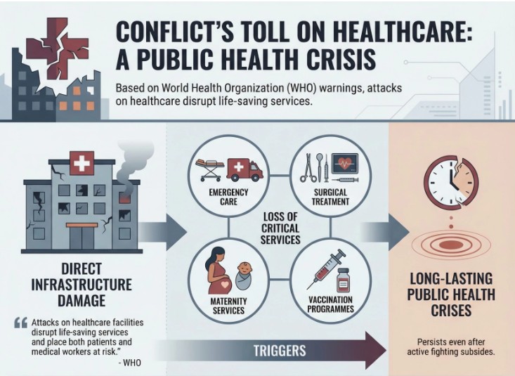 ಪಶ್ಚಿಮ ಏಷ್ಯಾದಲ್ಲಿ ಹೆಚ್ಚಿರುವ ಸಂಘರ್ಷವು ಕೇವಲ ಯುದ್ಧಕ್ಕೆ ಸೀಮಿತವಾಗದೆ, ಬೃಹತ್ ಸಾರ್ವಜನಿಕ ಆರೋಗ್ಯ ಬಿಕ್ಕಟ್ಟಾಗಿ ಮಾರ್ಪಡುತ್ತಿದೆ ಎಂದು ವಿಶ್ವ ಆರೋಗ್ಯ ಸಂಸ್ಥೆ ಎಚ್ಚರಿಸಿದೆ. ಇರಾನ್ ಸೇರಿದಂತೆ ಹಲವು ಭಾಗಗಳಲ್ಲಿ ಕ್ಷಿಪಣಿ ದಾಳಿ ಮತ್ತು ಬಾಂಬ್ ಸ್ಫೋಟಗಳಿಂದ ಉಂಟಾಗುತ್ತಿರುವ ಗಂಭೀರ ಗಾಯಗಳು ಆಸ್ಪತ್ರೆಗಳನ್ನು ಹೈರಾಣಾಗಿಸಿವೆ. ಶಸ್ತ್ರಚಿಕಿತ್ಸಾ ಉಪಕರಣಗಳ ಕೊರತೆ ಮತ್ತು ವೈದ್ಯಕೀಯ ಸಿಬ್ಬಂದಿಯ ಮೇಲಿನ ಒತ್ತಡ ಪರಿಸ್ಥಿತಿಯನ್ನು ಮತ್ತಷ್ಟು ಹದಗೆಡಿಸಿದೆ. ಇರಾನ್ನಲ್ಲಿ ಸುಮಾರು ೧,೩೦೦ಕ್ಕೂ ಹೆಚ್ಚು ಸಾವುಗಳು ಮತ್ತು ೯,೦೦೦ಕ್ಕೂ ಹೆಚ್ಚು ಗಾಯಾಳುಗಳು ದಾಖಲಾಗಿದ್ದಾರೆ.