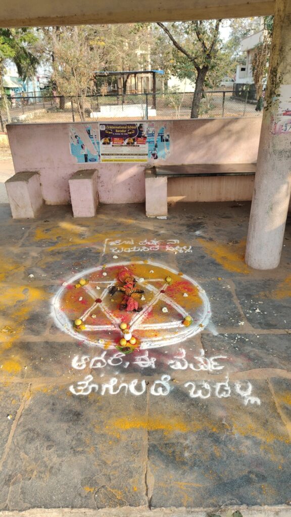 ಗದಗ: ಮುಂಡರಗಿ ಪಟ್ಟಣದ ಹುಡ್ಕೋ ಕಾಲೋನಿಯ ಬಸ್ ನಿಲ್ದಾಣದಲ್ಲಿ ವಾಮಾಚಾರದ ಕುರುಹುಗಳು ಪತ್ತೆಯಾಗಿದ್ದು, ಸ್ಥಳೀಯ ಜನರಲ್ಲಿ ತೀವ್ರ ಭೀತಿ ಮತ್ತು ಆತಂಕ ಸೃಷ್ಟಿಸಿದೆ. ನಕ್ಷತ್ರದ ಆಕಾರದ ರೇಖಾಚಿತ್ರದ ಮೇಲೆ ಕಪ್ಪು ಬಣ್ಣದ ಗೊಂಬೆ, ಮೊಟ್ಟೆ, ಎಲೆ ಅಡಿಕೆ ಹಾಗೂ ನಿಂಬೆಹಣ್ಣುಗಳನ್ನು ಇರಿಸಿ ಈ ಕೃತ್ಯ ಎಸಗಲಾಗಿದೆ. ವಿಶೇಷವಾಗಿ, ‘ಹೋದ ವರ್ಷ ನಾನು ಬಯಸಿದ್ದು ಸಿಕ್ಕಿಲ್ಲ, ಆದರೆ ಈ ವರ್ಷ ಅದನ್ನು ಪಡೆದೇ ತೀರುತ್ತೇನೆ’ ಎಂಬ ಬರಹವು ಅಲ್ಲಿ ಕಂಡುಬಂದಿದ್ದು, ಸಾರ್ವಜನಿಕರನ್ನು ಬೆಚ್ಚಿಬೀಳಿಸಿದೆ.