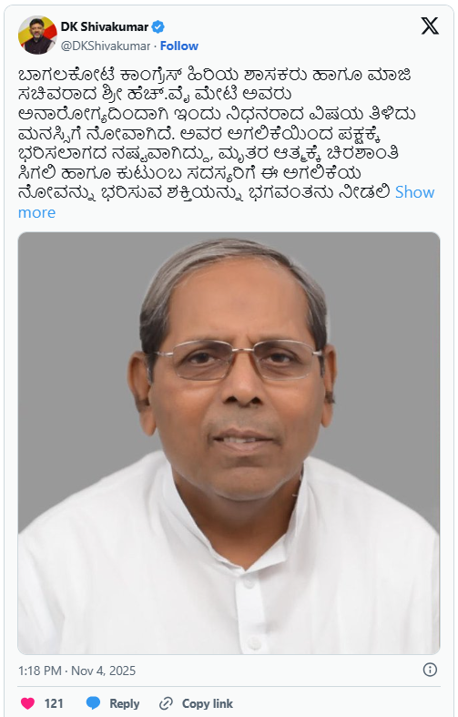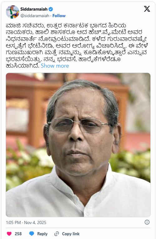 ಹಿರಿಯ ರಾಜಕಾರಣಿ ಎಚ್.ವೈ. ಮೇಟಿ ಅವರು ಅನಾರೋಗ್ಯದ ಹಿನ್ನೆಲೆಯಲ್ಲಿ ನಿಧನರಾದ ಸುದ್ದಿ ತಿಳಿದು ದುಃಖವಾಗಿದೆ. ಭಗವಂತ ಅವರ ಆತ್ಮಕ್ಕೆ ಶಾಂತಿ ನೀಡಲಿ, ಕುಟುಂಬದವರು ಮತ್ತು ಅಭಿಮಾನಿಗಳಿಗೆ ಅವರ ಅಗಲಿಕೆಯ ದುಃಖವನ್ನು ಭರಿಸುವ ಶಕ್ತಿ ನೀಡಲಿ ಎಂದು ಪ್ರಾರ್ಥಿಸುತ್ತೇನೆ ಎಂದು ಜೆಡಿಎಸ್ ನಾಯಕ ನಿಖಿಲ್ ಕುಮಾರಸ್ವಾಮಿ ಅವರು ಪೋಸ್ಟ್ ಮಾಡಿದ್ದಾರೆ.