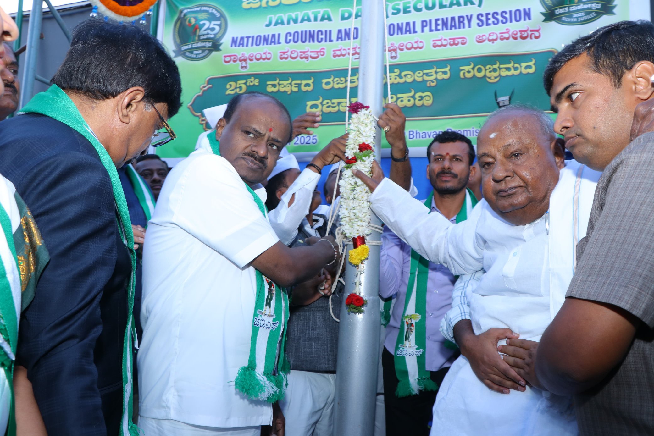 ಬೆಂಗಳೂರು: ಜೆಡಿಎಸ್ ಪಕ್ಷಕ್ಕೆ 25 ವರ್ಷ ತುಂಬಿದ ಹಿನ್ನೆಲೆ ನಿನ್ನೆ ಬೆಂಗಳೂರಿನಲ್ಲಿರುವ ಜೆಪಿ ಭವನದ ಪಕ್ಷದ ಕಚೇರಿಯ ಆವರಣದಲ್ಲಿ ರಜತ ಮಹೋತ್ಸವ ಕಾರ್ಯಕ್ರಮ ಆಯೋಜಿಸಲಾಗಿತ್ತು. ಜೆಡಿಎಸ್ ರಾಷ್ಟ್ರೀಯ ಅಧ್ಯಕ್ಷರಾಗಿ ಮಾಜಿ ಪ್ರಧಾನಿ ದೇವೇಗೌಡ, ರಾಜ್ಯಾಧ್ಯಕ್ಷರಾಗಿ ಕೇಂದ್ರ ಸಚಿವ ಕುಮಾರಸ್ವಾಮಿ ಅವರು ಪುನರ್ ಆಯ್ಕೆ ಆಗಿದ್ದಾರೆ.