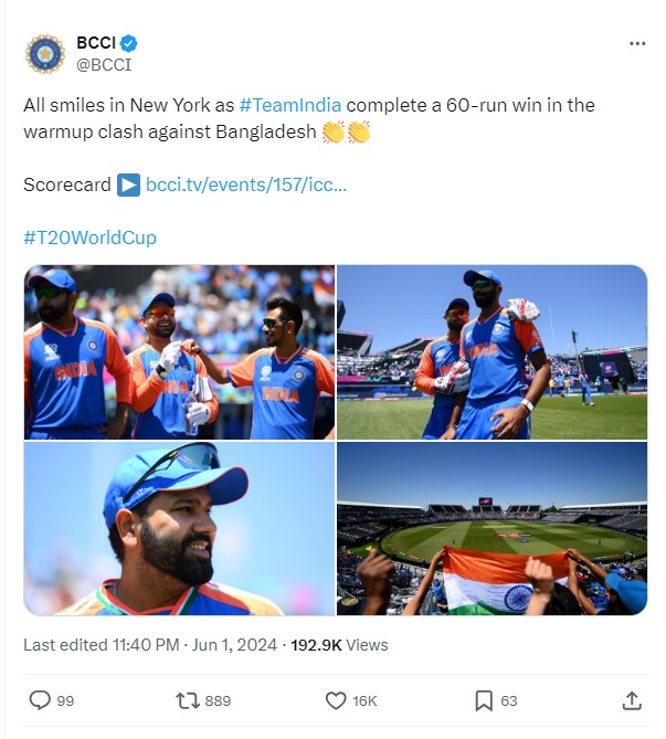 ನ್ಯೂಯಾರ್ಕ್: ಬ್ಯಾಟಿಂಗ್ ಹಾಗೂ ಬೌಲಿಂಗ್ ಎರಡೂ ವಿಭಾಗಗಳಲ್ಲಿ ಸಂಘಟಿತ ಪ್ರದರ್ಶನ ತೋರಿದ ಭಾರತ ತಂಡ, 2024ರ ಐಸಿಸಿ ಟಿ20 ವಿಶ್ವಕಪ್ ಟೂರ್ನಿಯ ಅಭ್ಯಾಸ ಪಂದ್ಯದಲ್ಲಿ ಬಾಂಗ್ಲಾದೇಶ ವಿರುದ್ದ 60 ರನ್ಗಳ ಭರ್ಜರಿ ಗೆಲುವು ಪಡೆಯಿತು. ಆ ಮೂಲಕ ತನ್ನ ಮೊದಲನೇ ಪಂದ್ಯಕ್ಕೂ ಮುನ್ನ ಟೀಮ್ ಇಂಡಿಯಾ ವಿಶ್ವಾಸವನ್ನು ಹೆಚ್ಚಿಸಿಕೊಂಡಿದೆ.