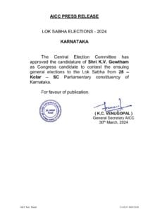ಕೋಲಾರ : ಲೋಕಸಭಾ ಚುಣಾವಣೆಯಲ್ಲಿ ಕಾಂಗ್ರೆಸ್ ಪಕ್ಷಕ್ಕೆ ಕಗ್ಗಂಟಾಗಿದ್ದ ಕೋಲಾರ ಟಿಕೆಟ್ ಕಡೆಗೂ ಘೋಷಣೆ ಯಾಗಿದೆ. ಕಳೆದ ಕೆಲವು ದಿನಗಳಿಂದ ಇಡೀ ರಾಷ್ಟ್ರವ್ಯಾಪಿ ಚರ್ಚೆಗೆ ಕಾರಣವಾಗಿದ್ದ ಕೋಲಾರ ಲೋಕಸಭಾ ಕ್ಷೇತ್ರದ ಕಾಂಗ್ರೆಸ್ ಟಿಕೆಟ್ ವಿಚಾರ ಶನಿವಾರ ಅಂತಿಮವಾಗಿದೆ.
