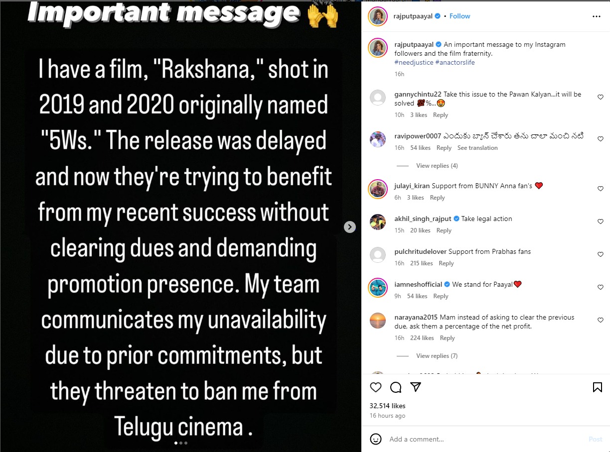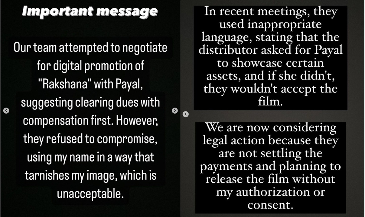ಚಿತ್ರದ ಪ್ರಚಾರಕ್ಕೆ ಬರದೇ ಇದ್ದರೆ ತೆಲುಗು ಉದ್ಯಮದಿಂದ ಬ್ಯಾನ್ ಮಾಡುವುದಾಗಿ ಬೆದರಿಕೆ ಹಾಕುತ್ತಿದ್ದಾರೆ. ನನ್ನ ತಂಡ ಬಾಕಿ ಮೊತ್ತದ ಬಗ್ಗೆ ಚರ್ಚಿಸಿದಾಗ ರಾಜಿ ಮಾಡಿಕೊಳ್ಳಲು ನಿರಾಕರಿಸಿದರು. ನನ್ನ ಹೆಸರನ್ನು ಡ್ಯಾಮೇಜ್ ಆಗುವಂತೆ ಬಳಸಲಾಗುತ್ತಿದೆ. ಇತ್ತೀಚಿನ ಮೀಟಿಂಗ್ನಲ್ಲಿ ನನ್ನ ಬಗ್ಗೆ ಅಸಭ್ಯ ಭಾಷೆ ಬಳಸಲಾಗಿದೆ. ನನಗೆ ನೀಡಬೇಕಾದ ಸಂಪೂರ್ಣ ಸಂಭಾವನೆಯನ್ನು ನೀಡದೆ ಚಿತ್ರವನ್ನು ಬಿಡುಗಡೆ ಮಾಡಲು ಯೋಜಿಸಿದ್ದಕ್ಕಾಗಿ ನಾನು ಈಗ ಕಾನೂನು ಕ್ರಮ ಕೈಗೊಳ್ಳಬೇಕು ಎಂದುಕೊಂಡಿದ್ದೇನೆ ಎಂದು ಪಾಯಲ್ ಬರೆದುಕೊಂಡಿದ್ದಾರೆ.