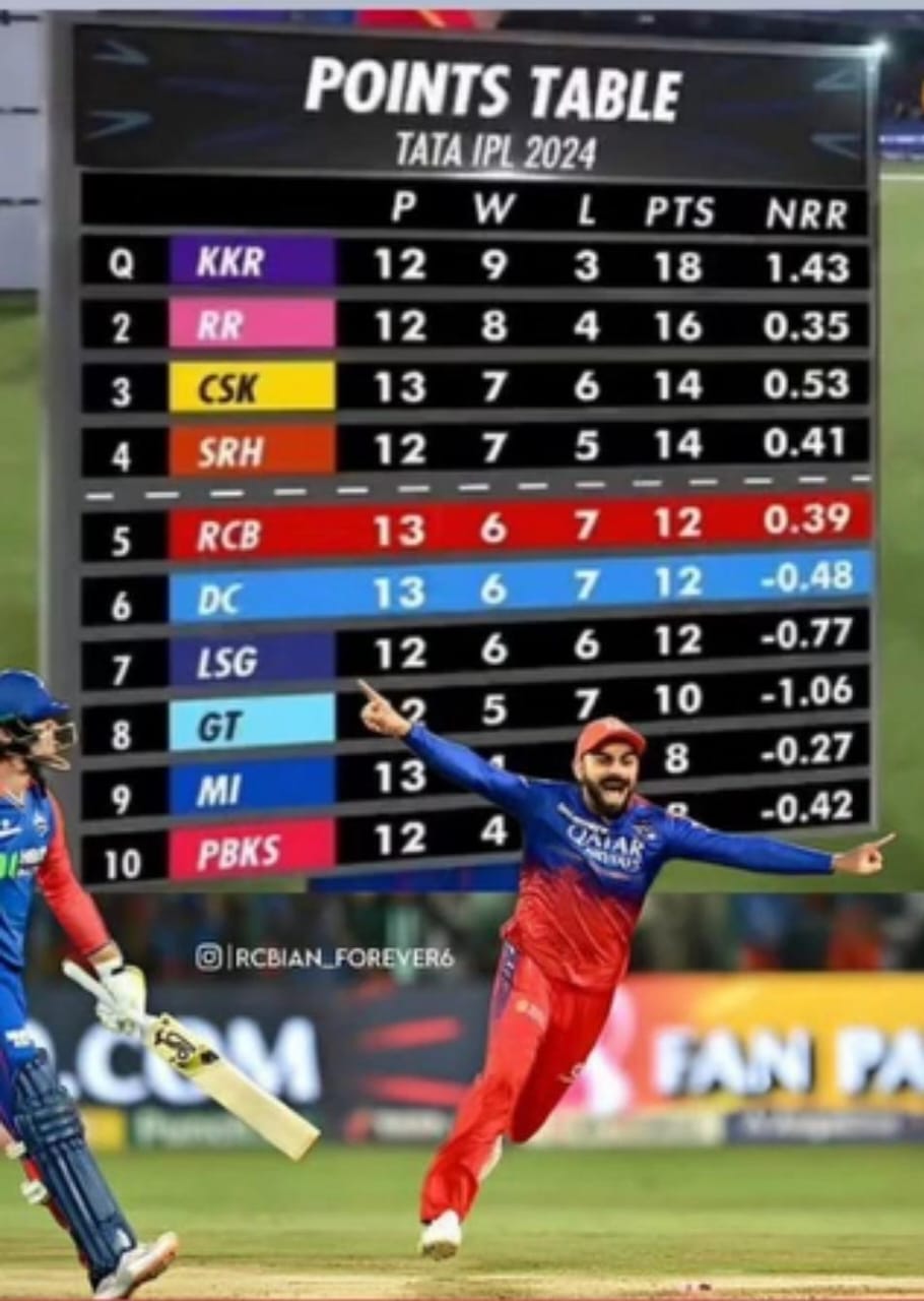 ಆರ್ಸಿಬಿ ಈ ಗೆಲುವಿನ ಮೂಲಕ ಅಂಕಪಟ್ಟಿಯಲ್ಲಿ ಐದನೇ ಸ್ಥಾನಕ್ಕೆ ಜಿಗಿತ ಕಂಡಿದೆ. ಎಲ್ಎಸ್ಜಿ ಪಂದ್ಯ ತಮ್ಮ ಮುಂದಿನ ಎರಡು ಪಂದ್ಯಗಳಲ್ಲಿ ಒಂದನ್ನು ಸೋತು, ಜಿಟಿ ಒಂದು ಪಂದ್ಯ ಸೋತರೆ ಆರ್ ಸಿಬಿ ಮತ್ತು ಸಿಎಸ್ಕೆ ನಡುವಿನ ಪಂದ್ಯದಲ್ಲಿ ಗೆಲ್ಲುವ ತಂಡ ಪ್ಲೇ ಆಫ್ಗೆ ಅರ್ಹತೆ ಪಡೆಯಲಿದೆ