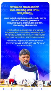 ಬೆಂಗಳೂರು: ನಾಳೆಯಿಂದ ಮುಂದಿನ ಮೂರು ದಿನಗಳ ಕಾಲ ಸಾರ್ವಜನಿಕರು, ಪಕ್ಷದ ಮುಖಂಡರು, ಕಾರ್ಯಕರ್ತರು ಸೇರಿದಂತೆ ಯಾರನ್ನೂ ಭೇಟಿಯಾಗಲು ಸಾಧ್ಯವಿಲ್ಲ ಎಂದು ಡಿಸಿಎಂ ಡಿ.ಕೆ ಶಿವಕುಮಾರ್​ ಹೇಳಿದ್ದಾರೆ.