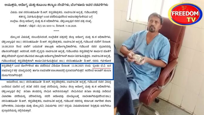 ಚಿಕ್ಕಬಳ್ಳಾಪುರದ ಗುಡಿಬಂಡೆಯ ತಾಲೂಕು ವೈದ್ಯಾಧಿಕಾರಿ ಮಾಡ್ತಿದ್ದ ಲಂಚಬಾಕತನವನ್ನ ನಿಮ್ಮ ಫ್ರೀಡಂ ಟಿವಿ ಜಗಜ್ಜಾಹೀರು ಮಾಡಿತ್ತು. ಈ ವರದಿ ಸರ್ಕಾರದ ಕಣ್ಣಿಗೂ ಬಿದ್ದಿತ್ತು. ಇದೇ ವರದಿಯನ್ನ ಉಲ್ಲೇಖಿಸಿ ಈಗ ಇಂಥಾ ಲಂಚಬಾಕ ಭ್ರಷ್ಟ ಅಧಿಕಾರಿ ಡಾ.ನರಸಿಂಹ ಮೂರ್ತಿಯನ್ನು ಸರ್ಕಾರ ಅಮಾನತುಗೊಳಿಸಿದೆ.