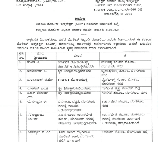 ಶೇಖರ್ ಜಿ. – ಜಾಲಹಳ್ಳಿ ಸಂಚಾರ ಪೊಲೀಸ್ ಠಾಣೆ, ಬೆಂಗಳೂರು, ಶಿವಕುಮಾರ್ ಪಿ, – ಬೈಯಪ್ಪನಹಳ್ಳಿ ಪೊಲೀಸ್ ಠಾಣೆ, ಬೆಂಗಳೂರು, ಸತೀಶ್ ಕುಮಾರ್, ಗಿರಿನಗರ ಪೊಲೀಸ್ ಠಾಣೆ, ಬೆಂಗಳೂರು, ಯೇರಿಸ್ವಾಮಿ ಈ, ಕಾಟನ್ ಪೇಟೆ ಪೊಲೀಸ್ ಠಾಣೆ, ಬೆಂಗಳೂರು, ತಿಪ್ಪೇಸ್ವಾಮಿ ಬಿ.ಎಂ, ಆನೇಕಲ್ ಪೊಲೀಸ್ ಠಾಣೆ,ಸತೀಶ್ ಬಿ.ಎಸ್, ಪರಪ್ಪನ ಅಗ್ರಹಾರ ಪೊಲೀಸ್ ಠಾಣೆ, ಗೋವಿಂದರಾಜು, ಪುಲಕೇಶಿ ನಗರ ಪೊಲೀಸ್ ಠಾಣೆ, ಬೆಂಗಳೂರು ಸೇರಿದಂತೆ 25 ಇನ್ಸ್ ಪೆಕ್ಟರ್ ಗಳ ವರ್ಗಾವಣೆ ಮಾಡಲಾಗಿದೆ.
