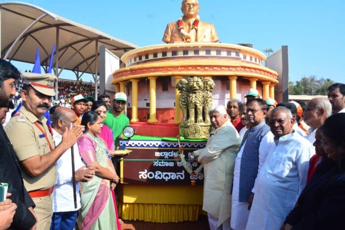 ಗದಗ: 75 ನೇ ವರ್ಷದ ಸಂವಿಧಾನ ಅಮೃತ ಮಹೋತ್ಸವದ ಸಂದರ್ಭದಲ್ಲಿ ರಾಜ್ಯ ಸರ್ಕಾರ ಸಂವಿಧಾನದ ಜಾಗೃತಿ ಬಗೆಗೆ ರಾಜ್ಯಾದ್ಯಂತ ಗ್ರಾಮ ಪಂಚಾಯತಿ, ಹೋಬಳಿ ಕೇಂದ್ರ ಮತ್ತು ಜಿಲ್ಲಾ ಕೇಂದ್ರಗಳಲ್ಲಿ ಸಂವಿಧನ ಜಾಗೃತಿ ಜಾಥಾ ಆಯೋಜಿಸಲಾಗಿದೆ. ನಗರದ ಕೆ.ಎಚ್.ಪಾಟೀಲ ಜಿಲ್ಲಾ ಕ್ರೀಡಾಂಗಣದಲ್ಲಿ ಶುಕ್ರವಾರದಂದು ಜಿಲ್ಲಾ ಉಸ್ತುವಾರಿ ಸಚಿವ ಎಚ್.ಕೆ.ಪಾಟೀಲ ಅವರು ಸಂವಿಧಾನ ಜಾಗೃತಿ ರಥಕ್ಕೆ ಚಾಲನೇ ನೀಡಿದರು.