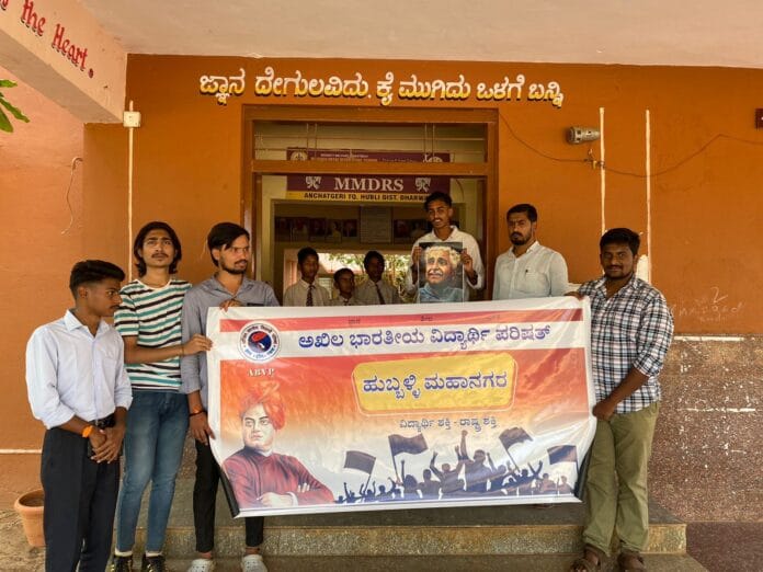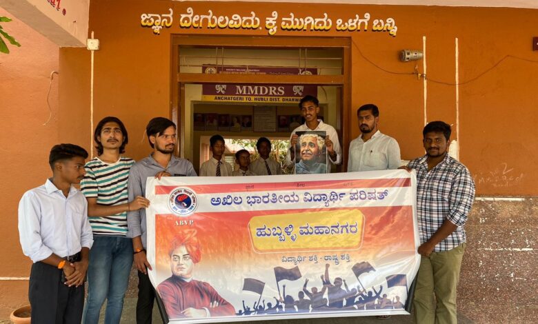 ಹುಬ್ಬಳ್ಳಿ : ರಾಜ್ಯದಲ್ಲಿನ ಸರ್ಕಾರಿ ಶಾಲೆ ಸೇರಿದಂತೆ ವಸತಿ ಶಾಲೆಗಳ ಪ್ರವೇಶದಲ್ಲಿರುವ ಜ್ಞಾನ ದೇಗುಲವಿದು ಕೈ ಮುಗಿದು ಒಳಗೆ ಬನ್ನಿ ಬರಹವನ್ನು ಬದಲಾಯಿಸುತ್ತಿರುವ ಸರ್ಕಾರದ ನಡೆಯನ್ನು ಖಂಡಿಸಿ ಹಾಗೂ ಈ ನಿರ್ಧಾರದಿಂದ ಹಿಂದೆ ಸರಿಯುವಂತೆ ಅಗ್ರಹಿಸಿ ಹುಬ್ಬಳ್ಳಿಯಲ್ಲಿ ಎಬಿವಿಪಿ ಕಾರ್ಯಕರ್ತರು ಸರ್ಕಾರದ ವಿರುದ್ಧ ಆಕ್ರೋಶ ಹೊರಹಾಕಿದರು.