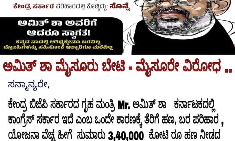 ಇಂದು ಮೈಸೂರು ಜಿಲ್ಲೆಗೆ ಕೇಂದ್ರ ಗೃಹ ಸಚಿವು ಅಮಿತ್ ಶಾ ಆಗಮಿಸಿದ್ದಾರೆ. ಈ ಸಂದರ್ಭದಲ್ಲಿ ಮೈಸೂರು ಕಾಂಗ್ರೆಸ್ ಘಟಕದಿಂದ ಪ್ರತಿಭಟನೆಗೆ ಸಿದ್ಧತೆ ನಡೆಸಲಾಗಿದೆ. ಮೈಸೂರು ಗ್ರಾಮಾಂತರ ಅಧ್ಯಕ್ಷ ಡಾ.ಬಿ.ಜೆ. ವಿಜಯಕುಮಾರ್ ನೇತೃತ್ವದಲ್ಲಿ “ನನ್ನ ತೆರಿಗೆ ನನ್ನ ಹಕ್ಕು” ಘೋಷಣೆಯೊಂದಿಗೆ “ಬರದಿಂದ ನಲುಗುತ್ತಿರುವ ನಾಡಿಗೆ ಬರಿಗೈಯಲ್ಲಿ ಬಂದಿರಾ?” ಎಂಬ ಪ್ರಶ್ನೆಯೊಂದಿಗೆ ಪೋಸ್ಟರ್ ಅಭಿಯಾನ ನಡೆಸಲು ಕಾರ್ಯಕರ್ತರು ಸಜ್ಜಾಗಿದ್ದಾರೆ.
