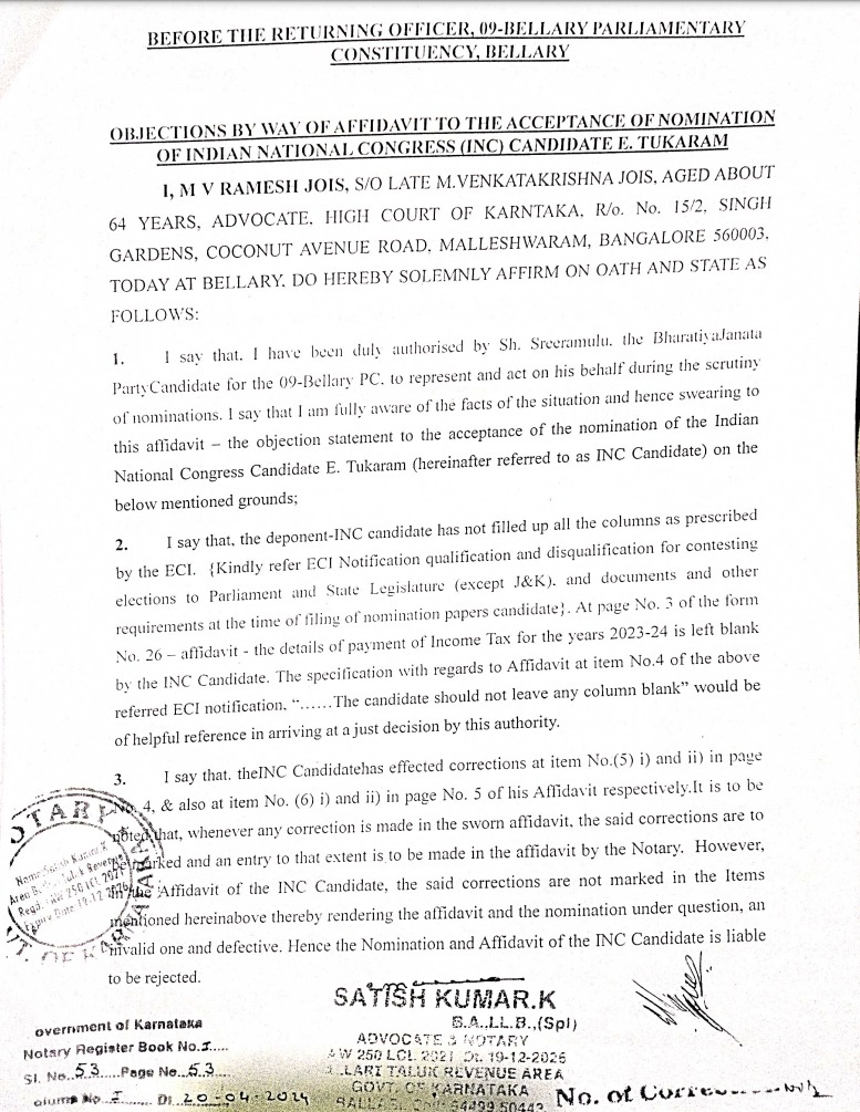 ಕಾಂಗ್ರೆಸ್ ಅಭ್ಯರ್ಥಿ ತುಕಾರಾಂ ತಂದೆ ಓಬಣ್ಣ ಮತ್ತು ಅವಲಂಬಿತರು ಎಂದು ನಮೂದು ಮಾಡಿ, ಅವರ ಸಾಲ ಚಿರಾಸ್ಥಿ ಮಾಹಿತಿ ನೀಡಿರುವುದಿಲ್ಲ. ಹೀಗಾಗಿ ಘೋಷಣೆ ಪತ್ರದಲ್ಲಿ ಕಾನೂನಾತ್ಮಕತೆ ಇಲ್ಲ. ಹೀಗಾಗಿ ಕಾಂಗ್ರೆಸ್ ನಾಮಪತ್ರ ರಿಜೆಕ್ಟ್ ಮಾಡಬಹುದಾಗಿದೆ.