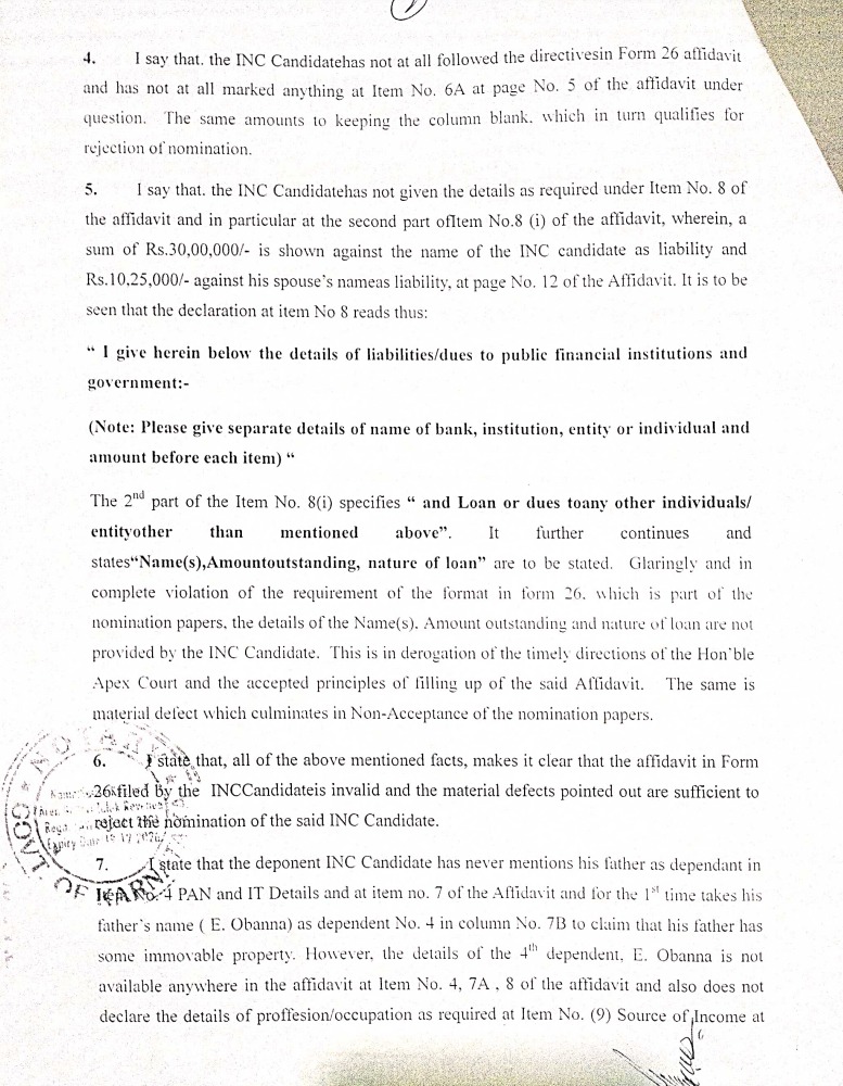 ಚುನಾವಣಾಧಿಕಾರಿಗೆ ಆಕ್ಷೇಪಣಾ ಪತ್ರ ಸಲ್ಲಿಸಿರುವ ಅವರು, ಕಾಂಗ್ರೆಸ್ ಅಭ್ಯರ್ಥಿ ನಾಮ ಪತ್ರವನ್ನು ರದ್ದುಗೊಳಿಸಬೇಕು ಎಂದಿದ್ದಾರೆ. ಘೋಷಣೆ ಪತ್ರದಲ್ಲಿ ನ್ಯೂನತೆಗಳಿದ್ದು, ಈ ಪತ್ರದಲ್ಲಿ ನೋಟರಿ ಮುಂದೆ ಸಹಿ ಮಾಡಿರುವುದಿಲ್ಲ. ಹೀಗಾಗಿ ಈ ಘೋಷಣೆ ಪತ್ರ ಕಾನೂನಾತ್ಮಕವಾಗಿಲ್ಲ.