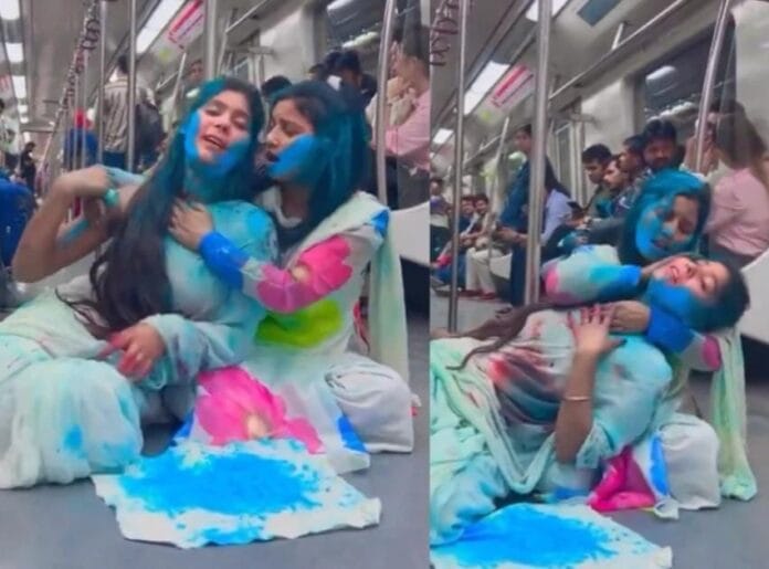 ನವದೆಹಲಿ: ಯುವತಿಯರಿಬ್ಬರು ದೆಹಲಿ ಮೆಟ್ರೋ ರೈಲಿನಲ್ಲಿ ಹೋಳಿ ಆಚರಿಸುವ ನೆಪದಲ್ಲಿ ಅಸಭ್ಯವಾಗಿ ವರ್ತಿಸಿದ್ದು, ಇದರ ವಿಡಿಯೋ ವೈರಲ್ ಆಗಿದೆ.