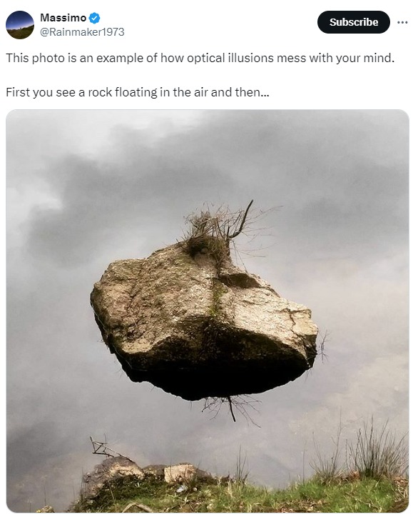 ಬೆಂಗಳೂರು : ಇಂದಿನ ಆಪ್ಟಿಕಲ್ ಇಲ್ಯೂಷನ್ಸ್ ಸವಾಲಿನ ಆಟದಲ್ಲಿ ನಿಮಗೆ ಚಿತ್ರವನ್ನು ಮೊದಲು ನೋಡಿದಾಗ ಕಲ್ಲು ಗಾಳಿಯಲ್ಲಿ ತೇಲಾಡುವ ರೀತಿಯಲ್ಲಿ ಕಾಣಿಸುತ್ತಿರಬಹುದು. ಆದರೆ ಆ ಚಿತ್ರದಲ್ಲಿ ಕಲ್ಲು ಗಾಳಿಯಲ್ಲಿ ತೇಲಾಡುದಿಲ್ಲ ಬದಲಾಗಿ ನೀರಿನಲ್ಲಿದೆ ಎಂಬುದು ನಿಮಗೆ ತಿಳಿದಿದೆಯೇ? ಚಿತ್ರವನ್ನು ಕೆಲ ಹೊತ್ತು ಸರಿಯಾಗಿ ಗಮನಿಸಿದರೆ ಮಾತ್ರ ವಾಸ್ತವವಾಗಿ ಚಿತ್ರ ಏನು ಎಂಬುದನ್ನು ತಿಳಿಯಲು ಸಾಧ್ಯ.