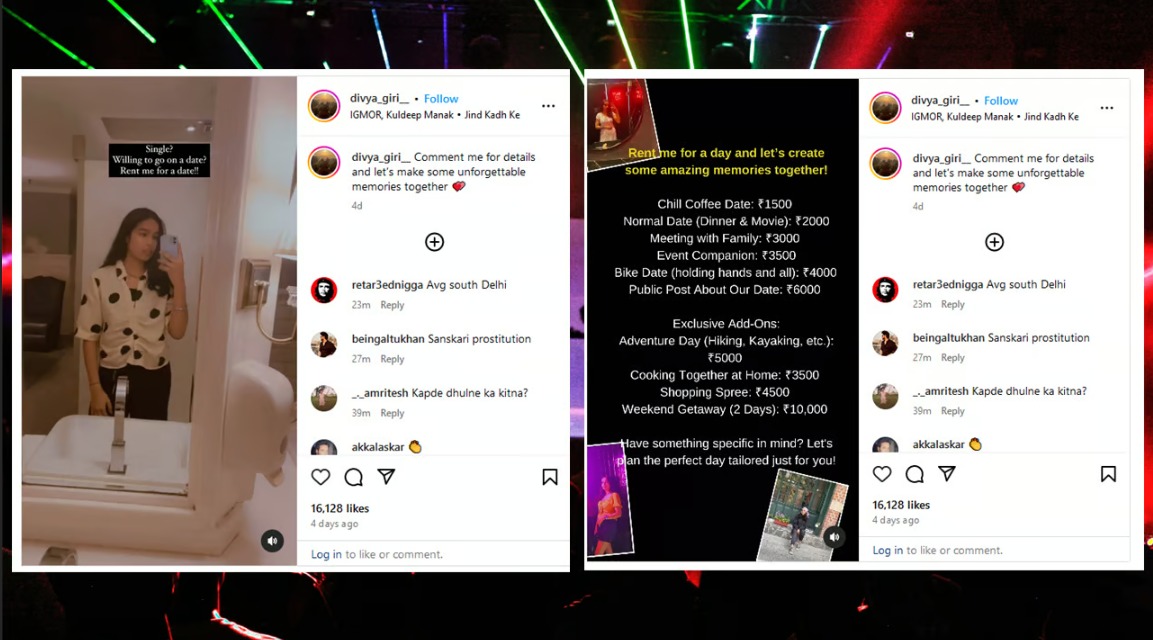 divya_giri__ ಎಂಬ ಇನ್ಸ್ಟಾಗ್ರಾಂ ಖಾತೆಯಿಂದ ಪೋಸ್ಟ್ ಮಾಡಿರುವ ಯುವತಿ, ‘ನೀವು ಸಿಂಗಲ್ ಆಗಿ ಬೇಜಾರಾಗಿದ್ದೀರಾ? ನಾನು ನಿಮ್ಮೊಂದಿಗೆ ಡೇಟ್ ಮಾಡಲು ರೆಡಿ. ಆದರೆ, ದಿನಕ್ಕೆ 5 ಸಾವಿರ ರೂಪಾಯಿ ಕೊಡಬೇಕು ಎಂದು ಬರೆದುಕೊಂಡಿದ್ದಾಳೆ. ಅಷ್ಟು ಮಾತ್ರವಲ್ಲದೇ ಡೇಟಿಂಗ್ ವೇಳೆ ನೀಡುವ ಪ್ರತೀ ”ಸೇವೆ” (Service)ಗೂ ಇಂತಿಷ್ಟು ಹಣ ಎಂದು ರೇಟ್ ಕಾರ್ಡ್ ಅನ್ನು ಕೂಡ ನೀಡಿದ್ದಾಳೆ.