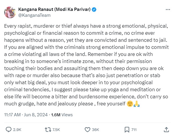 ಮುಂದುವರಿದು, ‘ನೀವು ಅಪರಾಧಿಗಳನ್ನು ಬೆಂಬಲಿಸಿದರೆ, ದೇಶದ ಎಲ್ಲ ಕಾನೂನುಗಳನ್ನು ಉಲ್ಲಂಘಿಸುವ ಅಪರಾಧವನ್ನು ಮಾಡಲು ಬಲವಾದ ಭಾವನಾತ್ಮಕ ಪ್ರಚೋದನೆ ನೀಡಿದಂತಾಗುತ್ತದೆ. ಯಾರೊಬ್ಬರ ಆತ್ಮೀಯ ವಲಯಕ್ಕೆ ನುಗ್ಗುವುದು, ಅವರ ಅನುಮತಿಯಿಲ್ಲದೆ ಅವರ ದೇಹವನ್ನು ಸ್ಪರ್ಶಿಸುವುದು ಮತ್ತು ಅವರ ಮೇಲೆ ಹಲ್ಲೆ ಮಾಡುವುದು ನಿಮಗೆ ಸರಿಯೆನಿಸಿದರೆ, ನೀವು ಅತ್ಯಾಚಾರ ಅಥವಾ ಕೊಲೆಯನ್ನು ಸಮರ್ಥಿಸುವಿರಿ. ಏಕೆಂದರೆ ಅದು ಕೂಡ ನಿಮ್ಮ ದೃಷ್ಟಿಯಲ್ಲಿ ದೊಡ್ಡ ವಿಚಾರವಾಗಿರುವುದಿಲ್ಲ. ನಿಮ್ಮ ಮಾನಸಿಕ ಅಪರಾಧ ಪ್ರವೃತ್ತಿಯನ್ನು ನೀವು ಆಳವಾಗಿ ನೋಡಬೇಕು’ ಎಂದು ಟ್ವೀಟ್ ಮಾಡಿದ್ದಾರೆ.