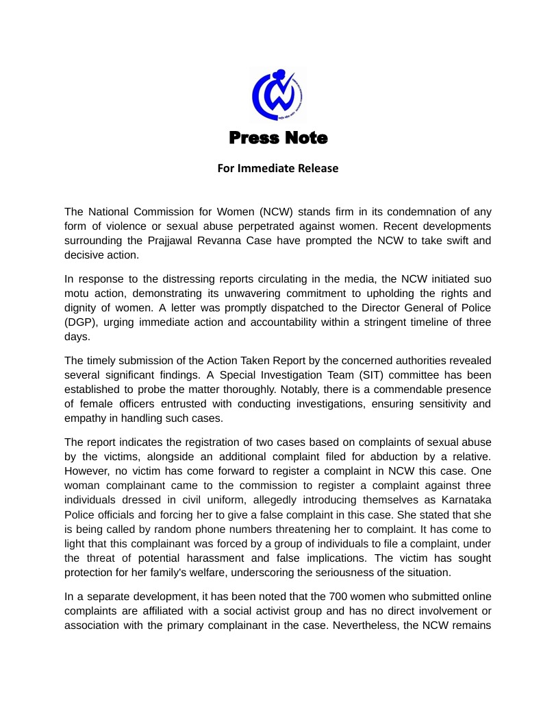 ಪ್ರಜ್ವಲ್ ರೇವಣ್ಣ ಪೆನ್ಡ್ರೈವ್ ಪ್ರಕರಣ ರಾಷ್ಟ್ರೀಯ ಮಹಿಳಾ ಆಯೋಗದಿಂದ ಮಾಧ್ಯಮ ಪ್ರಕಟಣೆಯಾಗಿದೆ. ಪ್ರಜ್ವಲ್ ರೇವಣ್ಣ ಕೇಸ್ ನಲ್ಲಿ NCW ಸ್ಪೋಟಕ ಹೇಳಿಕೆಯನ್ನು ನೀಡಿರುವ ಪ್ರಜ್ವಲ್ ರೇವಣ್ಣ ಕೇಸ್ ಸಂಬಂಧ ತನಿಖೆ ಮಾಡಲಾಗುತ್ತಿದೆ. ಇದಕ್ಕೆ ವಿಶೇಷ ತನಿಖೆ ತಂಡವನ್ನು ಕೂಡ ರಚನೆ ಮಾಡಲಾಗಿದೆ.