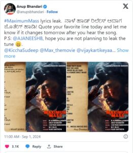 ‘ಮ್ಯಾಕ್ಸಿಮಮ್ ಮಾಸ್’ ಹಾಡಿಗೆ ಖ್ಯಾತ ಸಂಗೀತ ಸಂಯೋಜಕ ಬಿ. ಅಜನೀಶ್ ಲೋಕನಾಥ್ ಮ್ಯೂಸಿಕ್ ಕೊಟ್ಟಿದ್ದಾರೆ. ಚೇತನ್ ಗಂಧರ್ವ ಅವರು ಈ ಹಾಡನ್ನು ಹಾಡಿದ್ದಾರೆ. ಎಂಸಿ ಬಿಜ್ಜು ಹಾಡಿಗೆ ರ್ಯಾಪ್ ಮಾಡಿದ್ದಾರೆ. ಈ ಹಾಡು ಸದ್ಯ ‘ಸರೆಗಮ ಕನ್ನಡ’ ಯೂಟ್ಯೂಬ್ ಚಾನೆಲ್ ಮೂಲಕ ರಿಲೀಸ್ ಆಗಿದೆ. ಈ ಸಾಂಗ್ ರಿಲೀಸ್ ಆದ ಸ್ವಲ್ಪ ಹೊತ್ತಲ್ಲಿ ಸಾವಿರಾರು ಬಾರಿ ವೀಕ್ಷಣೆ ಕಂಡಿದೆ. ಸುದೀಪ್ ಜನ್ಮದಿನಕ್ಕೆ ಈ ಸಾಂಗ್ ರಿಲೀಸ್ ಆಗಿರೋದು ವಿಶೇಷ.
