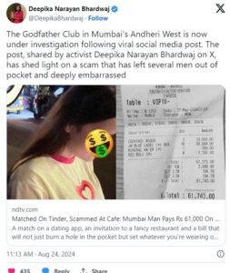 ಯುವತಿಯರು ಮತ್ತು ನೈಟ್ ಕ್ಲಬ್ ಗಳ ಈ ಮೋಸದಾಟವನ್ನು ಮಹಿಳಾ ವಕೀಲೆ ದೀಪಿಕಾ ನಾರಾಯಣ ಭಾರದ್ವಾಜ್ ಎಂಬುವವರು ಬಯಲಿಗೆಳೆದಿದ್ದು, ತಮ್ಮ ಎಕ್ಸ್ ಖಾತೆಯಲ್ಲಿ ಈ ಕುರಿತ ಮಾಹಿತಿ ಹಂಚಿಕೊಂಡಿದ್ದಾರೆ. ಪೋಸ್ಟ್ ನಲ್ಲಿ “ಬಯಲಾಯಿತು ಮುಂಬೈನ ದಿ ಗಾಡ್ಫಾದರ್ ಕ್ಲಬ್ ನ ಡೇಟಿಂಗ್ ಹಗರಣ ಬಹಿರಂಗ” ಎಂಬ ಶೀರ್ಷಿಕೆಯನ್ನು ಬರೆದುಕೊಂಡಿದ್ದಾರೆ. ವೈರಲ್ ಫೋಟೋದಲ್ಲಿ ಗಾಡ್ಫಾದರ್ ಕ್ಲಬ್ ನಲ್ಲಿ ಕಮ್ಮಿಗೆ ಸಿಗುವ ಆಹಾರ ಪಾನೀಯಗಳಿಗೂ ಸಾವಿರಾರು ಬಿಲ್ ಬಿಲ್ ಹಾಕಿರುವಂತಹ ದೃಶ್ಯವನ್ನು ಕಾಣಬಹುದು.