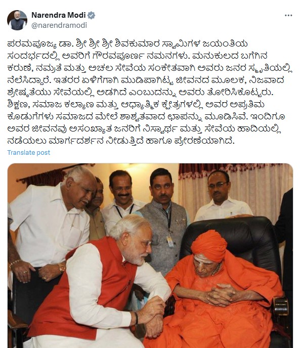ಈ ಸಂದರ್ಭದಲ್ಲಿ ಶ್ರೀಗಳ ಜೊತೆಗಿರುವ ಹಳೆಯ ಭಾವಚಿತ್ರವನ್ನು ಹಂಚಿಕೊಳ್ಳುವ ಮೂಲಕ ಪ್ರಧಾನಿಯವರು “ನಡೆದಾಡುವ ದೇವರು” ಎಂದೇ ಖ್ಯಾತರಾದ ಸಿದ್ದಗಂಗಾ ಶ್ರೀಗಳಿಗೆ ಗೌರವ ಅರ್ಪಿಸಿದ್ದಾರೆ.