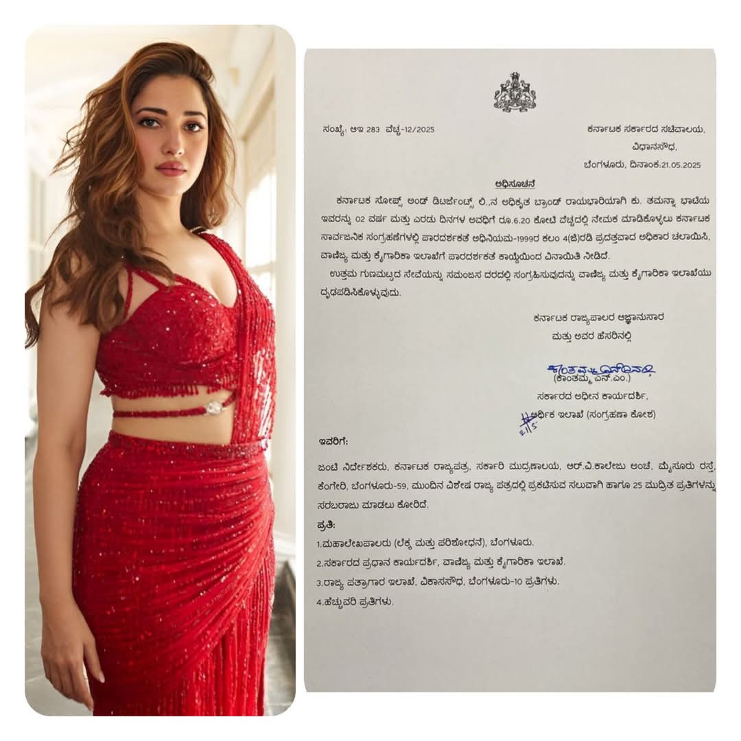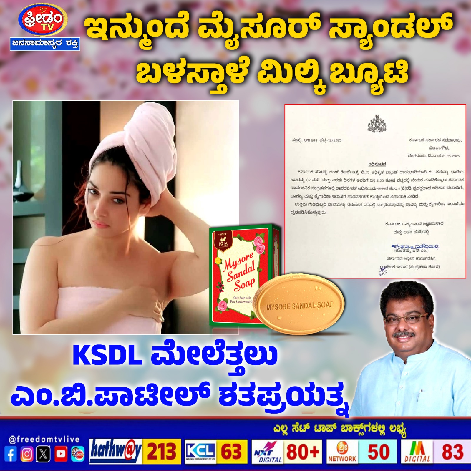 ಮೈಸೂರು ಸ್ಯಾಂಡಲ್ ಸೋಪ್ಗೆ ಬಹುಭಾಷಾ ನಟಿ, ಮಿಲ್ಕಿ ಬ್ಯೂಟಿ ತಮನ್ನಾ ಭಾಟಿಯಾ ರಾಯಭಾರಿಯಾಗಿ ಆಯ್ಕೆ ಮಾಡಲಾಗಿದೆ. ಈ ಬಗ್ಗೆ ಕರ್ನಾಟಕ ಸರ್ಕಾರದ ಸಚಿವಾಲಯ ಅಧಿಕೃತಗೊಳಿಸಿದೆ. ಕರ್ನಾಟಕ ಸೋಪ್ಸ್ ಅಂಡ್ ಡಿಟರ್ಜೆಂಟ್ ಲಿಮಿಟೆಡ್ನ ಅಧಿಕೃತ ಬ್ರಾಂಡ್ ಅಂಬಾಸಿಡರ್ ಆಗಿ ತಮನ್ನಾರನ್ನ, ಇಂದಿನಿಂದ 2 ವರ್ಷ 2 ದಿನಗಳ ಅವಧಿಗೆ, ಬರೋಬ್ಬರಿ 6.20 ಕೋಟಿ ನೀಡಿ ನೇಮಕ ಮಾಡಿಕೊಳ್ಳಲಾಗಿದೆ.