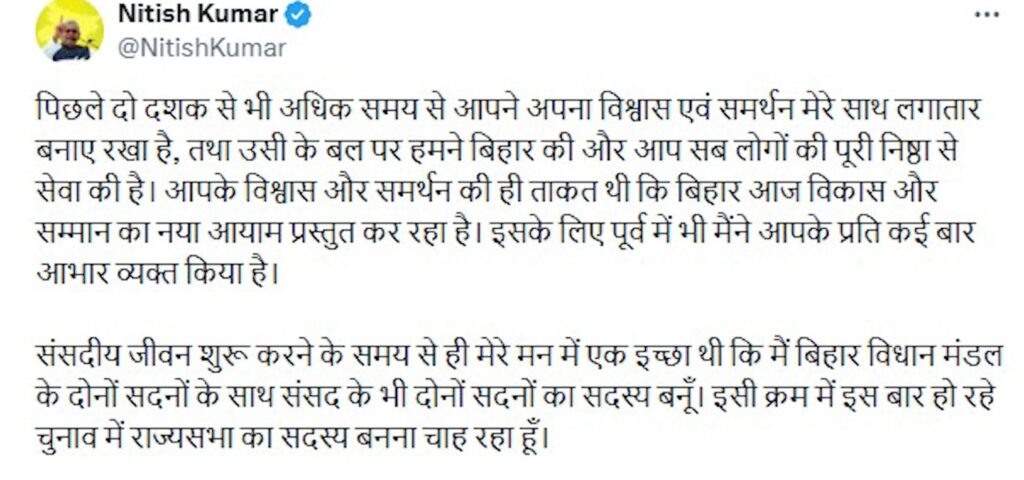 ಸಂಸತ್ತಿನ ಉಭಯ ಸದನಗಳ ಸದಸ್ಯನಾಗಬೇಕೆಂಬ ದಶಕಗಳ ಹಂಬಲ ಈಗ ಈಡೇರುತ್ತಿದೆ ಎಂದು ನಿತೀಶ್ ಕುಮಾರ್ ಭಾವುಕವಾಗಿ ಪೋಸ್ಟ್ ಮಾಡಿದ್ದಾರೆ. ಕಳೆದ ಎರಡು ದಶಕಗಳ ಕಾಲ ತಮಗೆ ಬೆಂಬಲ ನೀಡಿದ ಬಿಹಾರದ ಜನತೆಗೆ ಧನ್ಯವಾದ ಅರ್ಪಿಸಿರುವ ಅವರು, ಶೀಘ್ರದಲ್ಲೇ ರಾಜ್ಯಸಭೆಗೆ ನಾಮಪತ್ರ ಸಲ್ಲಿಸುವುದಾಗಿ ಸ್ಪಷ್ಟಪಡಿಸಿದ್ದಾರೆ. ಇದು ಬಿಹಾರದ ರಾಜಕೀಯ ಸಮೀಕರಣವನ್ನೇ ಸಂಪೂರ್ಣವಾಗಿ ಬದಲಿಸಲಿದೆ.
