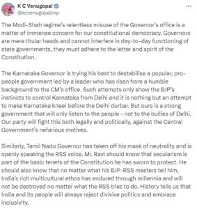 ನವದೆಹಲಿ: ಮುಡಾ ವಿವಾದದಲ್ಲಿ ಮುಖ್ಯಮಂತ್ರಿ ಸಿದ್ದರಾಮಯ್ಯ ಅವರ ವಿರುದ್ಧ ತನಿಖೆಗೆ ಕರ್ನಾಟಕ ಹೈಕೋರ್ಟ್ ಅನುಮತಿ ನೀಡಿದೆ ಹೊರತಾಗಿಯೂ, ಸಿಎಂ ರಾಜೀನಾಮೆ ಪ್ರಶ್ನೆಯೇ ಇಲ್ಲ ಎಂದು ಕಾಂಗ್ರೆಸ್ ಹೈಕಮಾಂಡ್ ಸ್ಪಷ್ಟಪಡಿಸಿದೆ. ಪ್ರಕರಣ ಸಂಬಂಧ ಸಿದ್ದರಾಮಯ್ಯ ಬೆಂಬಲಕ್ಕೆ ನಿಂತಿರುವ ಪಕ್ಷದ ಕೇಂದ್ರ ನಾಯಕತ್ವ, ಈ ಪ್ರಕರಣವನ್ನು ರಾಜಕೀಯವಾಗಿ ಮತ್ತು ಕಾನೂನು ಮಾರ್ಗದ ಮೂಲಕ ಎದುರಿಸುವುದಾಗಿ ಘೋಷಿಸಿದೆ. ಈ ಕುರಿತು ಟ್ವಿಟರ್‌ನಲ್ಲಿ ಪ್ರತಿಕ್ರಿಯೆ ನೀಡಿರುವ ಪಕ್ಷದ ರಾಷ್ಟ್ರೀಯ ಸಂಘಟನಾಕಾರ್ಯದರ್ಶಿ ಕೆ.ಸಿ.ವೇಣುಗೋಪಾಲ್, ‘ಮೋದಿ- ಅಮಿಶಾ ಆಡಳಿತದಲ್ಲಿ ರಾಜ್ಯಪಾಲರ ಕಚೇರಿಯನ್ನು ದುರ್ಬಳಕೆ ಮಾಡುತ್ತಿರುವುದು ನಮ್ಮ ಸಾಂವಿಧಾನಿಕ ಪ್ರಜಾಪ್ರಭುತ್ವದ ಬಗ್ಗೆ ಭಾರೀ ಕಳವಳ ಹುಟ್ಟುವಂತೆ ಮಾಡಿದೆ ಎಂದಿದ್ದಾರೆ.