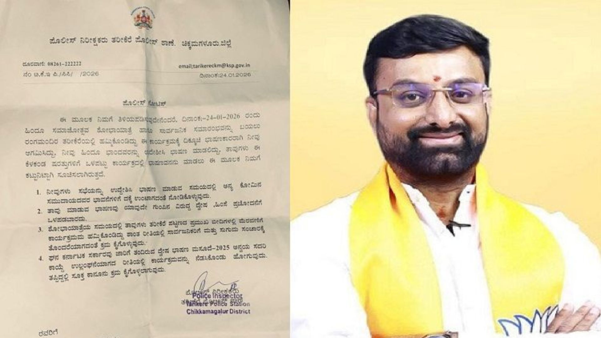 ತರಿಕೇರೆ ಪಟ್ಟಣದಲ್ಲಿ ಹಮ್ಮಿಕೊಳ್ಳಲಾಗಿದ್ದ ಶೋಭಾಯಾತ್ರೆಗೆ ಸಂಬಂಧಿಸಿದಂತೆ ಪೊಲೀಸರು ವಿಕಾಸ್ ಪುತ್ತೂರು ಅವರಿಗೆ ನೋಟಿಸ್ ನೀಡಿದ್ದಾರೆ. ಕರ್ನಾಟಕ ಸರ್ಕಾರವು ಜಾರಿಗೆ ತಂದಿರುವ ದ್ವೇಷ ಭಾಷಣ ಮಸೂದೆ-2025 ಅನ್ವಯ ಕಾಯ್ದೆ ಉಲ್ಲಂಘನೆಯಾಗದ ರೀತಿಯಲ್ಲಿ ಕಾರ್ಯಕ್ರಮ ನಡೆಸಬೇಕು. ಅನ್ಯ ಕೋಮಿನ ಭಾವನೆಗಳಿಗೆ ಧಕ್ಕೆ ತರುವಂತೆ ಅಥವಾ ಹಿಂಸೆಗೆ ಪ್ರಚೋದನೆ ನೀಡುವಂತೆ ಭಾಷಣ ಮಾಡಬಾರದು. ತಪ್ಪಿದ್ದಲ್ಲಿ ಕಾನೂನು ಕ್ರಮ ಕೈಗೊಳ್ಳಲಾಗುವುದು, ಎಂದು ಉಲ್ಲೇಖಿಸಲಾಗಿದೆ.