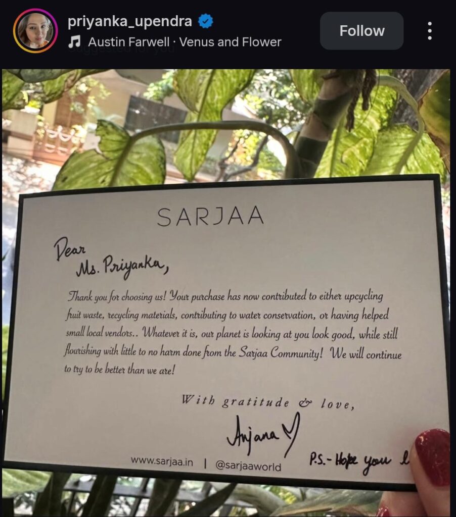 ತಮ್ಮ ಇನ್‌ಸ್ಟಾಗ್ರಾಮ್ ಪೋಸ್ಟ್‌ನಲ್ಲಿ ‘ಸಸ್ಟೈನಬಲ್ ಲಿವಿಂಗ್’ ಅಥವಾ ಸುಸ್ಥಿರ ಜೀವನಶೈಲಿಯ ಬಗ್ಗೆ ಸುದೀರ್ಘವಾಗಿ ಬರೆದುಕೊಂಡಿರುವ ಪ್ರಿಯಾಂಕಾ, ನಾವು ಬೆಳೆಯುತ್ತಿರುವಂತೆ ನಮ್ಮ ಆಯ್ಕೆಗಳು ಕೂಡ ಪ್ರಕೃತಿಗೆ ಪೂರಕವಾಗಿರಬೇಕು ಎಂದು ಅಭಿಪ್ರಾಯಪಟ್ಟಿದ್ದಾರೆ. ಪ್ರಾಣಿ ಹಿಂಸೆ ಇಲ್ಲದ ಮತ್ತು ಪರಿಸರಕ್ಕೆ ಹಾನಿ ಮಾಡದ ವಸ್ತುಗಳನ್ನು ಬಳಸುವ ಮೂಲಕ ಭೂಮಿಯ ಮೇಲಿನ ಕಾರ್ಬನ್ ಫುಟ್‌ಪ್ರಿಂಟ್ ಅನ್ನು ಕಡಿಮೆ ಮಾಡುವುದು ಇಂದಿನ ತುರ್ತು ಅಗತ್ಯವಾಗಿದೆ ಎಂಬ ಕರೆಯನ್ನು ನೀಡಿದ್ದಾರೆ.