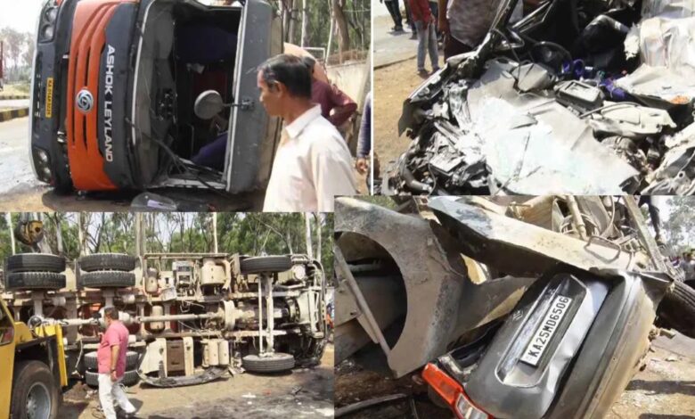 ರಸ್ತೆ ಅಪಘಾತ; ಕಾರಿನ ಮೇಲೆ ಉರುಳಿ ಬಿದ್ದ ಲಾರಿ ಪ್ರಾಣಾಪಾಯದಿಂದ ಮೂವರು ಪಾರು