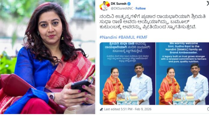 ಕರ್ನಾಟಕದ ಮನೆಮಾತಾಗಿರುವ ನಂದಿನಿ ಉತ್ಪನ್ನಗಳ ಪ್ರಚಾರ ರಾಯಭಾರಿಯಾಗಿ ಹಿರಿಯ ನಟಿ ಸುಧಾರಾಣಿ ಅವರು ಅಧಿಕೃತವಾಗಿ ನೇಮಕಗೊಂಡಿದ್ದಾರೆ. ಈ ಕುರಿತು ಬೆಂಗಳೂರು ಮತ್ತು ರಾಮನಗರ ಜಿಲ್ಲಾ ಸಹಕಾರ ಹಾಲು ಉತ್ಪಾದಕರ ಸಂಘಗಳ ಒಕ್ಕೂಟದ ಅಧ್ಯಕ್ಷರಾದ ಡಿ.ಕೆ. ಸುರೇಶ್ ಅವರು ತಮ್ಮ ಎಕ್ಸ್ ಖಾತೆಯಲ್ಲಿ ಅಧಿಕೃತವಾಗಿ ಮಾಹಿತಿಯನ್ನು ಹಂಚಿಕೊಂಡಿದ್ದಾರೆ.