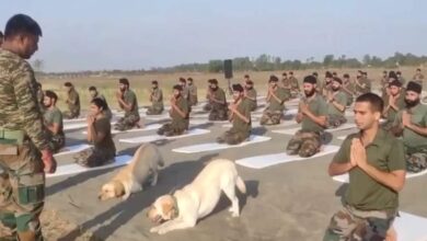 ಇಂಡೋ-ಪಾಕ್ ಗಡಿಯಲ್ಲಿ ಸೈನಿಕರೊಂದಿಗೆ ಯೋಗ ಪ್ರದರ್ಶಿಸಿದ ಶ್ವಾನಗಳು