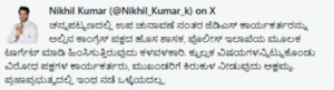 ಕಾಂಗ್ರೆಸ್ ನಾಯಕರ ಹೆದರಿಸಿ, ಬೆದರಿಸುವ ರಾಜಕೀಯಕ್ಕೆ ನಾವು ಬಗ್ಗಲ್ಲ. ವಿರೋಧ ಪಕ್ಷಗಳ ಕಾರ್ಯಕರ್ತರು ಹಾಗೂ ಮುಖಂಡರಿಗೆ ಕಿರುಕುಳ ನೀಡುವುದು ಅಕ್ಷಮ್ಯ. ಪ್ರಜಾಪ್ರಭುತ್ವ ವ್ಯವಸ್ಥೆಯಲ್ಲಿ ಇಂತಹ ನಡೆ ಒಳ್ಳೆಯದಲ್ಲ. ಅದನ್ನು ಸಹಿಸುವ ಪ್ರಶ್ನೆಯೂ ಇಲ್ಲ. ಆಡಳಿತಯಂತ್ರವನ್ನು ದುರುಪಯೋಗ ಪಡಿಸಿಕೊಂಡು ನಮ್ಮ ಕಾರ್ಯಕರ್ತರಿಗೆ ತೊಂದರೆ ಕೊಟ್ಟರೆ ಕೈಕಟ್ಟಿ ಕೂರುವ ಜಾಯಮಾನ ನಮ್ಮದಲ್ಲ. ಮುಂದಿನ ದಿನಗಳಲ್ಲಿ ಬೀದಿಗಿಳಿದು ಹೋರಾಟ ಮಾಡಬೇಕಾಗುತ್ತದೆ. ಕಾಂಗ್ರೆಸ್ ನಾಯಕರ ತಾಳಕ್ಕೆ ತಕ್ಕಂತೆ ಕುಣಿಯುವ ಯಾವುದೇ ಇಲಾಖೆಯ ಅಧಿಕಾರಿಗಳು ಅದಕ್ಕೆ ತಕ್ಕ ಬೆಲೆ ತೆರಬೇಕಾಗುತ್ತದೆ ಎಂದು ನಿಖಿಲ್ ಎಚ್ಚರಿಕೆ ನೀಡಿದ್ದಾರೆ.